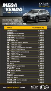 A Chevrolet emitirá, mensalmente, uma tabela atualizada com os valores de descontos para cada veículo. Essa tabela será disponibilizada no site do Creci Minas na área “Benefícios”.